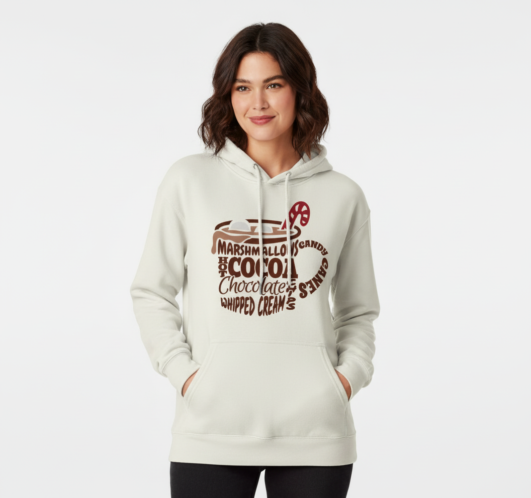 Because nothing says cozy season like a mug of hot cocoa topped with whipped cream! Our Jerzee Ivory Hoodie featuring a playful Hot Cocoa Chocolate Whipped Cream design is the perfect holiday sweatshirt for chilly nights, festive outings, or snuggling in with your favorite Christmas movie.