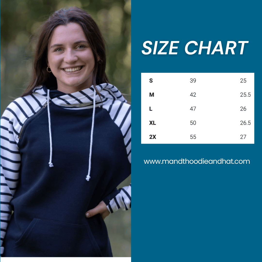 Stay cozy and stylish with the Madi Double Hood Pullover in Navy and White Stripes. Its unique design features a double hood with a contrasting striped inner hood and a fleece exterior hood. Plus, you'll love the decorative diagonal zipper (non-functional) on the right shoulder and the convenient front pocket. Order your today!
